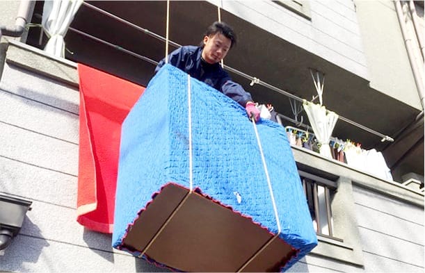 対応2階などに吊り上げて搬入した大型の家具やインテリアで、解体できないものは、ドアからの通常搬出はできません。そんなときでも、当社には吊り下げ撤去に慣れたスタッフが在籍しているのでご安心ください。大型の家財をプロのノウハウで迅速に運び出します。