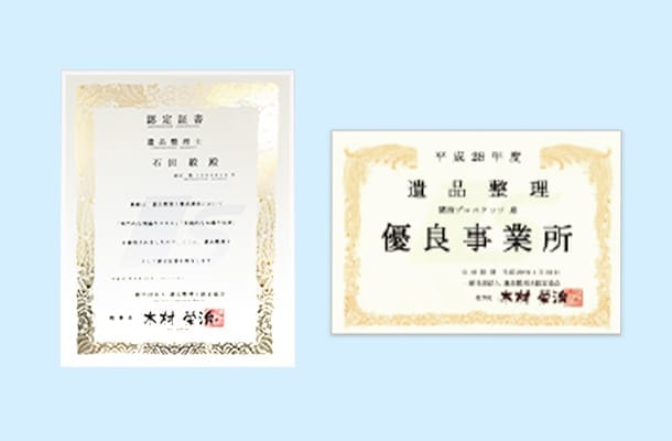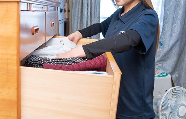 遺品整理士を中心にご遺族に代わってご遺品を整理します。生前整理でも、マナーを心得たスタッフが大切な家財を丁寧に扱います。